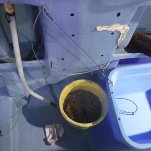 今回の釣り場は水深が40~60m程と浅く、釣り方は外房の伝統的な釣り方であるカモシ袋という袋に魚のミンチを入れたコマセ釣りであるカモシ釣りで釣りました。