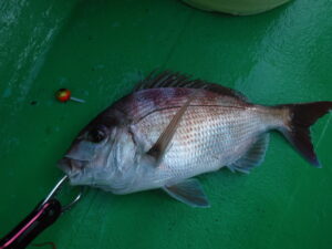 終了1時間前頃から若干沖に仕掛けが払い出すようになったので、トレーラーワームを投入すると、キャストしてからの斜め引きに立て続けに800g程の真鯛が連続ヒットしました。