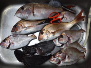 投入するとすぐに当たりが来て塩焼きサイズのチャリコ(チダイ)が釣れてきました。